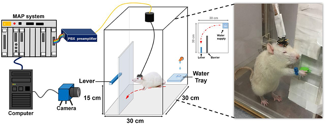 Fig3. System architecture and experimental setting of the water-reward lever-pressing task.