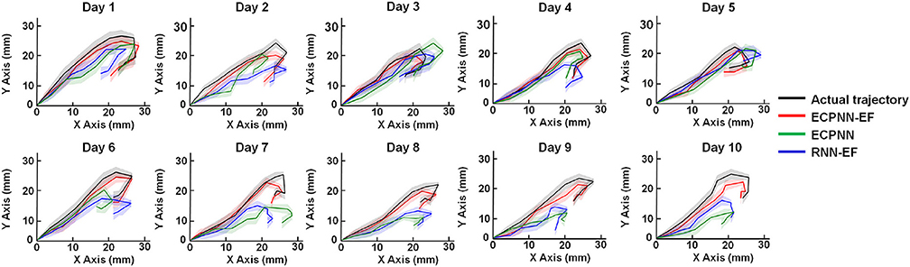 Fig5. Data visualization of average predicted trajectories of the ECPNN-EF, ECPNN, and RNN-EF.